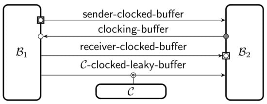 We specify leaky buffers using standard RSIM components. The hearth of the construction is a tag leaking machine and three buffers for input, output and leakage, see Figure A1. The machine accepts pairs of strings as inputs. When receives from the buffer , the pair is written to an output buffer and the annotation t is written to the sender-clocked buffer . There are two ports for clocking the leaky buffer. The first port determines when the annotation arrives to . The second port controls when and in which order message pairs are written to the port .