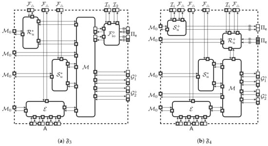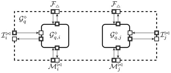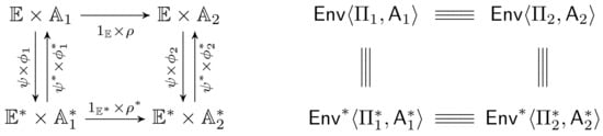 Note that constructions (1) together with equivalence relations (2)–(4) define a commutative square in Figure 2 with the equivalence guarantees for individual elements where for brevity pairs , and are defined through up or down arrows depending on the direction of traversal. As a result, the existence of implies the existence of , and vice versa.