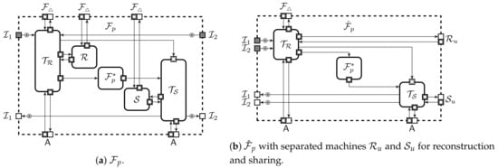 Let be the canonical ideal functionalities that the protection domain should implement. We will simplify the ideal functionalities by joining their sharing and reconstruction components. More formally, let be a machine that has k port pairs for reconstruction. A query to p-th pair is sent internally to that is part of the ideal functionality and the reply is routed back to the corresponding output port. Let be analogous extension of the machine . Note that and have only a single port pair for . Let be a collection we obtain by removing components and from as depicted in Figure 4b. Then, the ideal functionality for the protection domain is defined through a collection where only use public parameters. Let the corresponding extended collection be denoted as . The collection is observationally equivalent to provided that the trusted setup sends the same input parameters for all .