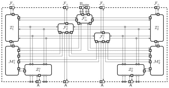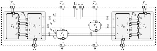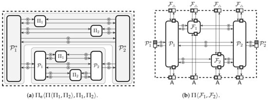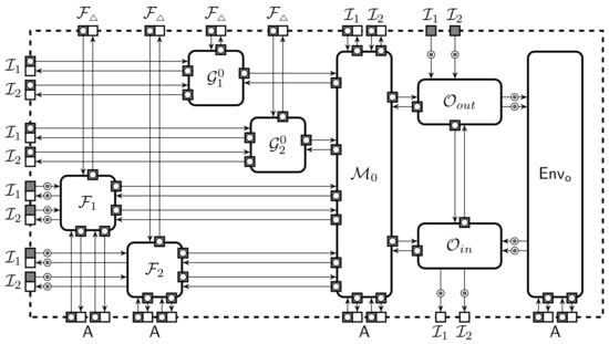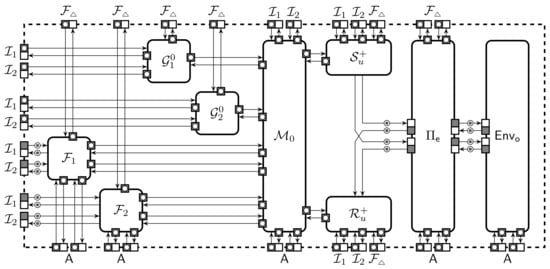 The theorem is particularly useful when the set of plausible environments and adversaries is closed, i.e., and . As security is commonly defined against nonuniform polynomial-time adversaries the second constraint is trivially satisfied. The first constraint is satisfied when environments consist of all sequential compositions of poly-time subprotocols. The resulting sequential composition theorems [29,30,44] play a central role in cryptography. Alternatively, we can consider the set of all concurrent compositions of poly-time subprotocols. The resulting security notion is known as universal composability (UC) and has many flavours [14,25,45,46,47,48,49,50] which differ in minor details. Most formalisations assume that machines and connections between them remain unaltered during the execution while Canetti’s second formalisation of universal composability [51] allows dynamic reconfiguration of the environment. We consider an extension of the RSIM model [25,27] which has leaky buffers for proper modelling of secure communication channels. The resulting adaptive-adversary RSIM is very close to the simplified version of UC (SUC) that was defined to characterise MPC protocols [52]. Our formalisation of MPC in RSIM gives us more flexibility to split protocols into components to modularise the proofs and transformations.