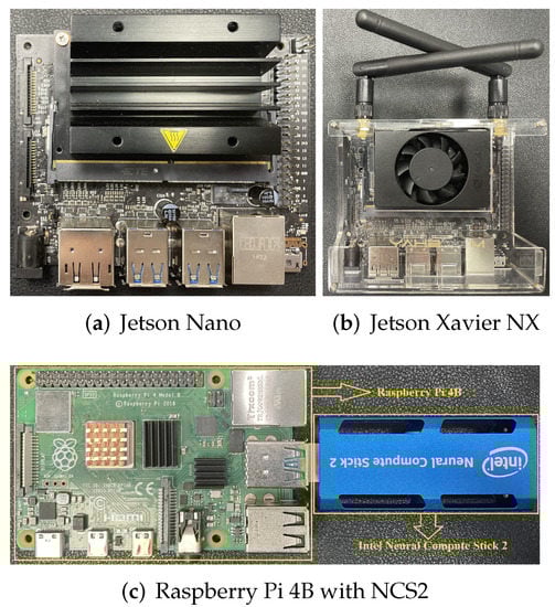 Due to the character of low power consumption, tiny volume and high performance, single-board computers are widely used in IoT scenarios and have become the main carrier of edge accelerators such as AI chips. As the carrier of the edge AI inference model, when the SBCs are combined with various edge accelerators, many AI applications can be implemented on them, uncovering exciting opportunities for building powerful applications with complicated learning objectives and demanding computations. Generally speaking, there are three ways to combine single board computers and edge accelerators: (1) GPU-based SBCs, which are suitable for general-purpose applications because of their good compatibility, such as Jetson Nano and JeVois A33 [14]; (2) Application Specific Integrated Circuit (ASIC)-based SBCs, which specialize in deep neural network applications, such as Intel’s vision processing unit (VPU) [15], Google’s tensor processing unit (TPU) [16] and Sipeed Maix Bit with K210 [14,17]; and (3) Field Programmable Gate Array (FPGA)-based SBCs, which are more energy efficienct [18]. Our work will be carried out on two kinds of GPU-based SBCs (NVIDIA Jetson Nano and NVIDIA Xavier NX) and a ASIC-based SBC (Raspberry Pi 4B with Intel Neural Compute Stick2).