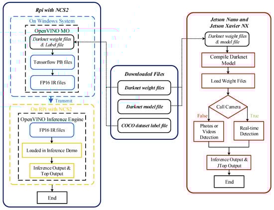In this paper, we used the pre-trained weights files of YOLO models from the Darknet website [41]. Figure 3 presents the compile process of YOLO models on the SBCs, which require different constraints, to fully exploit the SBCs for model inference. In this section, we will introduce the related process for compilation.