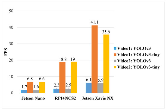The FPS of the model inference is a key metric for evaluating the video detection performance, which reflects the processing speed of an accelerator-based SBC to input data. Figure 4 summarizes the inference results of the FPS performance shown in Table 3, that measured across the YOLOv3 and YOLOv3-tiny running on accelerator-based SBCs.