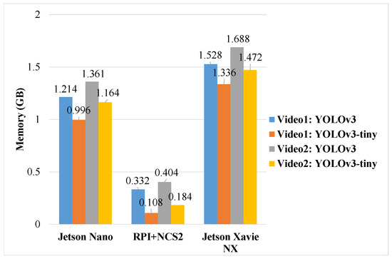 As the key resource of SBCs, memory usage can reflect the AI model carrying capacity of a SBC. As shown in Figure 5, the memory usage of YOLOv3-tiny is about 0.2GB less than that of YOLOv3 no matter whether it is on Jetson Nano, Jetson Xavier NX or RPi + NCS2 due to the fact that the feature extraction scales of YOLOv3-tiny are smaller than that of YOLOv3.