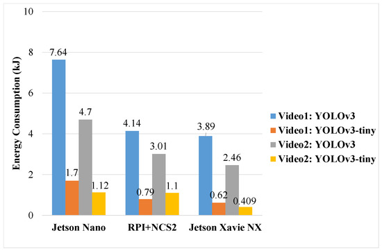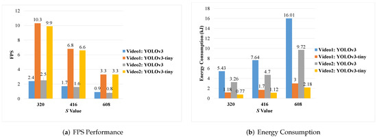 The results in Table 5 show the inference performance of YOLOv3 and YOLOv3-tiny with and when running on Jetson Nano. During the detection of each group of Video1 or Video2, as the resize window became smaller, i.e., the S value became smaller, the FPS increased, resulting in an increase in the number of frames for the CPU to read and process in per unit time, and an increase in CPU usage, which posed a great challenge to the performance of SBC’s CPU. Furthermore, there is an interesting phenomenon: when we put our focus on the GPU Power in Table 5 and Table 6, the influence of model change on GPU Power, which also reflects the GPU usage in some degree, was obviously less than that of input data size. We can conclude that larger frame size does not increase the use of GPU, but greatly increases the use of CPU and memory. Therefore, if it is necessary to use GPU to perform many tasks other than inference, minimizing the size of input data is an important method to keep the GPU-based SBCs running stably. At the same time, as shown in Figure 7, with the increase in S value, inference time increases while FPS decreases, which leads to a sharp increase in energy consumption, especially for YOLOv3. This means that when using AI models to deploy intelligence applications on edge devices, we must make a rigorous trade-off between inference accuracy and inference speed; YOLOv4-tiny is a perfect example.