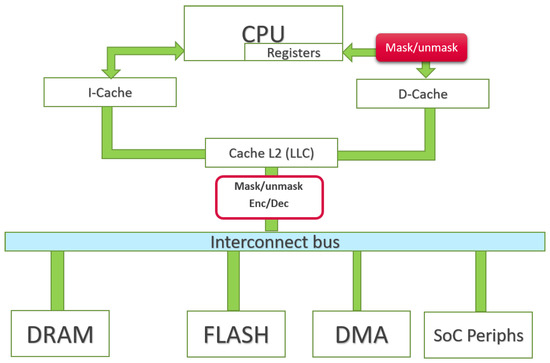 It is widely adopted in the literature that protecting such transfers can be done with encryption. Nonetheless, keeping encrypted data in cache memories (boxed in dotted lines in Figure 1) is more tricky than it seems. To do this, one needs to implement a module to decrypt the data upon a cache hit before sending it to the execute stage of the pipeline. This approach is time and area-consuming. To prevent this, boolean masking can help lighten the encryption in the cache memories. In practice, instead of sending encrypted data in the caches, we decrypt it at the output of the interconnect bus and mask it before sending it to the last level cache. At the output of the L1 cache, the masked data and the mask are sent to the registers. This provides inputs for the execute stage to process instructions on masked data. Figure 2 illustrates the described protection method which will be applied to a SoC embedding a 64 bit RISC-V CPU.