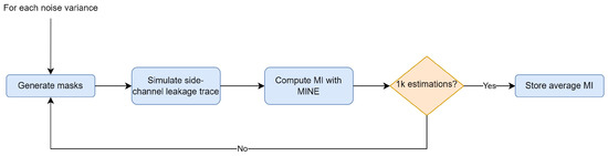 Figure 4 explains the experimental process we have been through for the MI estimation. For each noise variance, we generate the masks according to a given distribution (uniform or biased) and we simulate the corresponding side-channel leakage as explained in Section 5.1. Then we compute the MI between the trace and the unmasked data using the HW leakage model. 1000 MI estimations per noise variance were ran to remove measurement fluctuations due to noise.