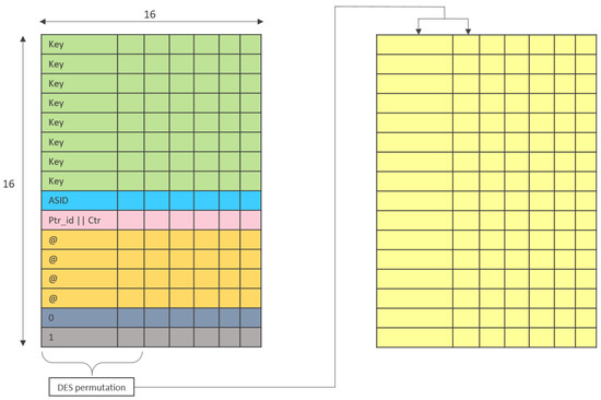 At the output of the first round, a 128-bit block is absorbed using the modified absorption function previously defined. The composition of the absorbed block is given by Equation (5) where denotes the 48 LSB bits of the address.