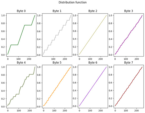 The structure of the initial state and the permutation performed on it, as well as the structure of the absorbed block, ensure that the masks produced are consequently variable, as can be seen in Figure 8 which shows the cumulative distribution functions of each byte of the masks (Mask 1). Here we can observe distribution functions that approach the one of uniform distribution. The same behaviour is observed in the distribution of the other 64 bits (Mask 2).