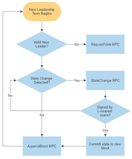 At the beginning of an election, a follower agent changes its state to a candidate, and it begins sending out signed RequestVote messages, including the latest block number to all the agents it can contact. The latest block represents the term number of the chosen leader. For every new term, a new leader is elected. Agent , who receives a RequestVote message, initially checks the following conditions: