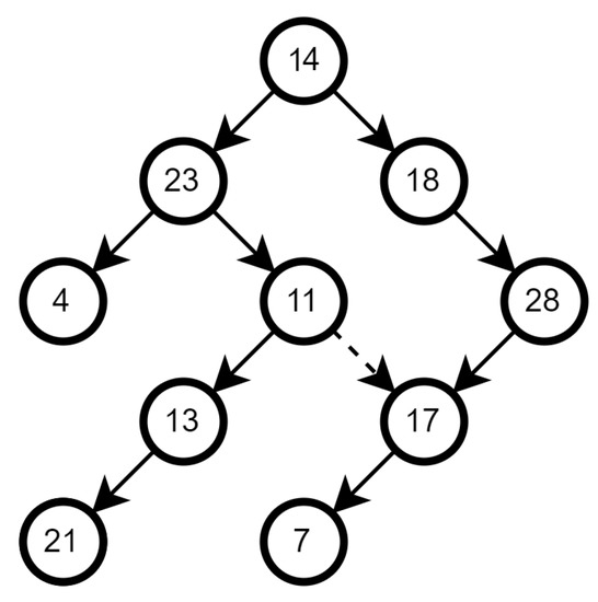 Here, , meaning that at most 2 neighboring agents can validate a message, and a total of signatures are required to validate any messages sent by agent 14, where and . The numbers within each node represent an agent ID. We can see that there are 3 valid tree paths: , and . In this example, agent number 17 signed 2 different chains. This is valid since it is the first signature on either path. The first path to arrive at the leader is likely to be the one added on the next block.
