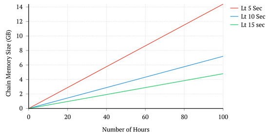 Next, from experimental evaluation, we know that the weight of a single StateChange message () is ≈ 1 KB, header () is ≈ 2 KB and an average of 200 StateChange messages can be added per block. This value is averaged by the amount of data a single agent can receive and handle. From (2), we can then calculate the total memory requirement for a single block to be ≈200 KB. Next, let us denote the length of the leadership term as . This value depicts how fast a new block is added to the chain. Different values can drastically increase or decrease the weight of the LSC chain. Figure 4 shows the exponential growth in memory size when increasing . Agents are then required to hold more than 2 GB of chain data per day on average, which can cause a problem for resource-constrained devices that are required to operate for a long period of time. This problem, however, can be addressed in either two ways: