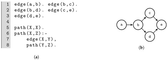 Program and represented graph for Example 1. (a) Program for deterministic path finding; (b) graph representation.