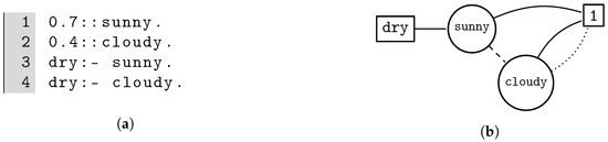 where f is an atom and represents its probability. The notation is the one adopted in ProbLog [29] while is used in LPADs [30]. For example, the program shown in Figure 2a contains two probabilistic facts: sunny, which is true with probability 0.7, and cloudy, which is true with probability 0.4.