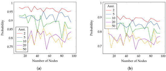 Results for PEP experiment for nodes with active probability 1 and 0.95. Different lines represent different payment sizes. (a) results for the PEP experiment with active probability set to 1; (b) results for the PEP experiment with active probability set to 0.95.