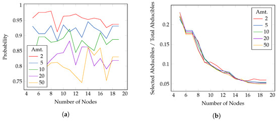 For the abductive model experiments, we randomly set half of the total edges of the networks as abducibles and insert a number of constraints equal to one quarter of the total number of edges. These constraints are deterministic and encode the incompatibility of a random pair of abducible edges each. The plots of Figure 4a,b show respectively the variation of the PEP and of the ratio between the selected abducibles and the total abducibles involved in the computation, with an increasing number of nodes (and thus of edges) and an increasing payment size. The active probability is set to 1. The variation of the PEP, as for the previous experiments, increases by increasing the payment size. However, the number of selected abducibles to maximize the PEP decreases as the number of nodes and edges increase, meaning that few nodes are involved in the routing process. This variation is similar for all the five amounts tested. For both this and the previous experiment, there are several jumps in the computed probability values. These jumps are more evident for bigger amounts, thus indicating that the choice of the payment size and the existing connection is crucial.