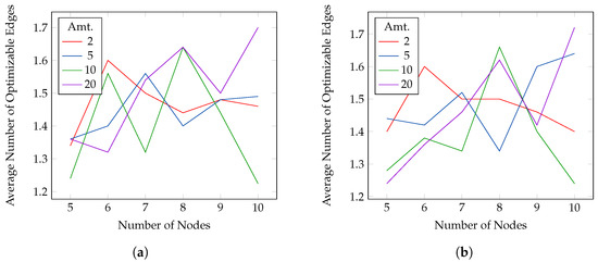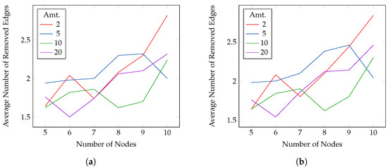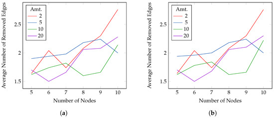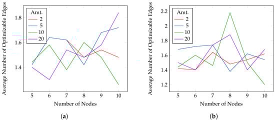 For the reducible experiments, we set all edges as reducible. The goal is to remove as many edges as possible while keeping the PEP between two random nodes above 0.6, 0.7 (Figure 7) 0.8, 0.9 (Figure 8). As for the optimizable experiment, the source–destination pair is the same for the four thresholds but changes for every instance and payment size. We chose the approximate algorithm. The figures show, on the y-axis, the average number of removed edges and on the x-axis the number of nodes in the network. For all, the active probability is set to 1. In this case, the number of selected edges is small with respect to the number of nodes, and it is usually bounded between 1.5 and 3. The results are similar for all the thresholds, but, in general, smaller payments allow for removing more edges.