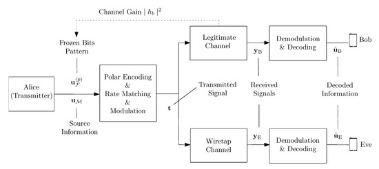 Polar code [27] has been studied for decades and has been used in Enhanced Mobile Bandwidth (EMBB) control channels for 5G communication systems. Corresponding decoding algorithms such as successive cancellation (SC) [28], successive cancellation list (SCL) and cyclic redundancy check-aided (CRC) SCL [29] algorithms perform recursive decoding based on the concatenated structure of polarized codes, which greatly improves decoding accuracy. The characteristics of the channel polarization make it suitable for PLS, and hence attract numerous researchers’ attention. For instance, the authors in [30] designed a PLS key generation scheme by selecting a frozen bits mapping pattern according to instantaneous CQI. Additionally, the strong and weak secrecy limits of PLS polarization codes are studied in [31,32], respectively.