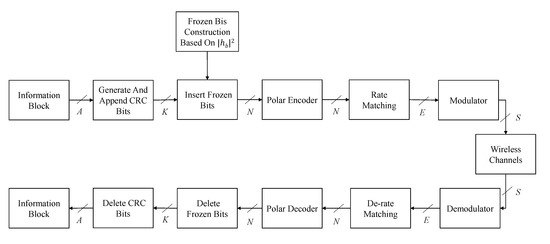 - Arikan, E. Channel polarization: A method for constructing capacity-achieving codes for symmetric binary-input memoryless channels. IEEE Trans. Inf. Theory 2009, 55, 3051–3073. [Google Scholar] [CrossRef]