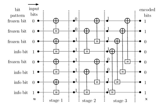 The encoding process can be implemented using the polar code graph in Figure 3, where the input core information block is on the left side of the graph and the core encoded block is output on the right side of the graph after successive exclusive OR (XOR) operations.