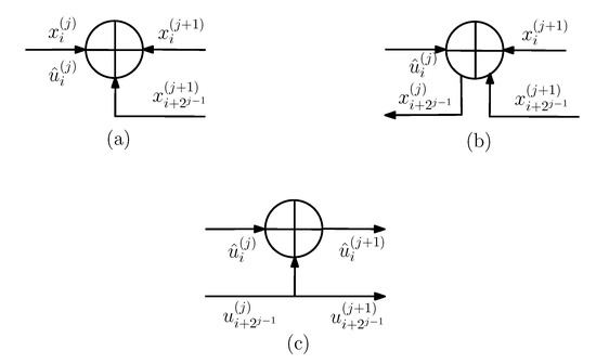 Combining these LLRs, the decoding mechanism is shown in Figure 4a, where the two connections on the right-hand side of the particular XOR both provide an LLR, and respectively. This enables the XOR to mod-2 sum of the and LLRs at the level, , , which can be expressed as