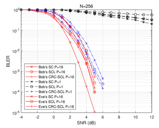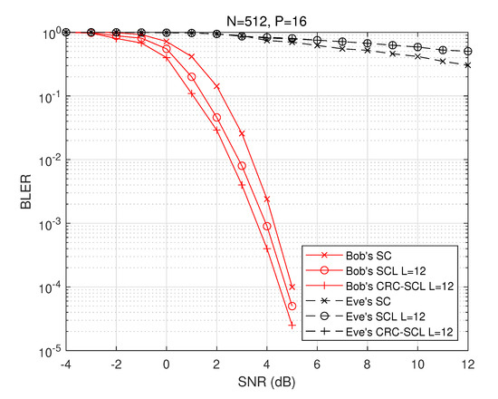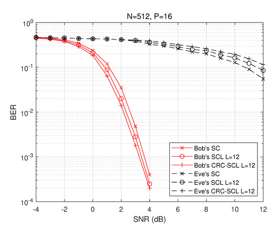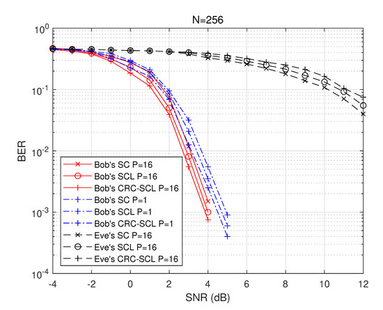 Eve combines these LLRs and performs three different XOR operations like Bob, and finally successfully estimates information bits transmitted by Alice . Furthermore, Eve can also decode by adding candidate decoding paths and a CRC check, using SCL and CRC-SCL. However, the biggest difference from Bob is that Eve determines the construction of frozen bits in the signal according to the gain of eavesdropping channel , and then estimates the bits transmitted by Alice through (7), which cannot obtain the legitimate channel gain . Therefore, Eve adopts the wrong frozen bit construction for decoding.