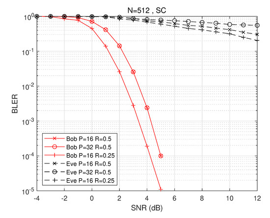Furthermore, the number of channel gain intervals P and the possible effect of the code rate R on this scheme are investigated in Figure 9. The formula (11) and Table 2 give details of the different frozen bit constructions at different intervals of P. As shown in Figure 9, there is almost no difference between the BLER of Bob using and intervals. This is because Bob knows clearly about the corresponding frozen bit construction pattern of the interval every time. The only performance difference results from the GA construction at different SNRs. By contrast, by comparing Eve’s decoding performance at and , it can be seen that Eve’s decoding performance decreases as P increases because as the interval of channel gain becomes larger, Alice has more different frozen bit constructions, which leads to a lower probability that Eve’s perceived frozen bit construction is the same as the one used by Alice, thus leading to a worse decoding performance. On the other hand, when we lower the code rate R, we can find that Bob’s performance improves at compared with . The reason for this is that as the code rate decreases, there are fewer locations to transmit confidential information, and thus Bob’s performance improves somewhat. Eve also has the same effect. Overall, Eve’s performance is well-suppressed and Bob’s performance is slightly improved as the number of channel gain intervals increases without changing the code rate.