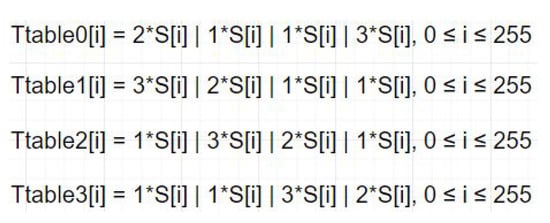 The T-table implementation pre-calculates and stores the 32-bit ak values for every possible 8-bit b value. Therefore, it is possible to calculate matrix C directly using matrix A. Figure 3 shows the four T-tables used for the implementation. It is also possible to store only one T-table and calculate the other three T-tables using logical rotate operations.
