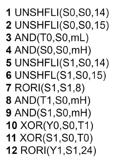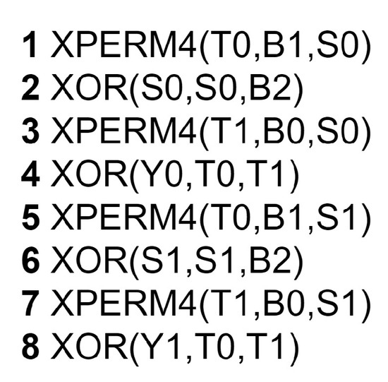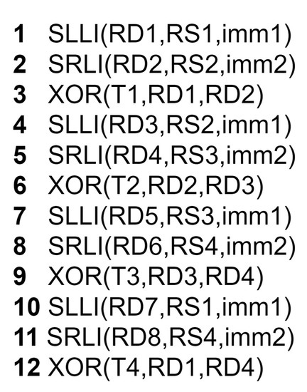PRESENT is a 64-bit block cipher that uses a substitution–permutation network of 31 rounds. “sBoxLayer” and “pLayer” are the two key parts of this algorithm. The assembly code in Figure 13 shows the “SBoxLayer” implementation with crossbar permutation instructions. The code performs the PRESENT SBOX transformation on each nibble of the registers S0 and S1.