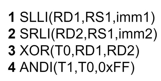 The algorithm has several bit permutations. The assembly code, shown in Figure 10, shows a basic way to perform single-bit permutation using rv32i. First, we shift a bit of the RS1 to the least significant bit position and mask it. Then, we shift the bit to its new position. It is possible to perform any bit permutation just by repeating these four assembly instructions.