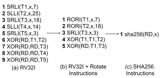 Each transformation function of SHA-256 is implemented as a single instruction in the cryptography extension. Figure 8 shows the three different software implementations of the SHA-256 0 (SIGMA0) function. All three implementations receive the register x as the input and store the 32-bit result into the register RD.