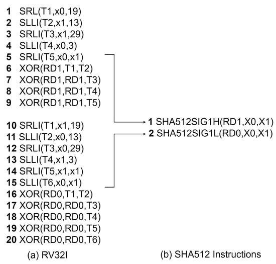 The SHA-512 transformation functions receive a 64-bit input and generate a 64-bit result. Therefore, each transformation function takes two SHA-512 instructions to calculate in a 32-bit RISC-V processor, and it is not possible to use 32-bit rotate instructions to perform a 64-bit rotate operation. Figure 9 shows the software implementations of the SHA-512 1 (SIGMA1) function.