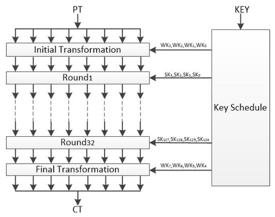 - Hong, D.; Sung, J.; Hong, S.; Lim, J.; Lee, S.; Koo, B.S.; Lee, C.; Chang, D.; Lee, J.; Jeong, K.; et al. HIGHT: A New Block Cipher Suitable for Low-Resource Device. In Cryptographic Hardware and Embedded Systems-CHES 2006; Goubin, L., Matsui, M., Eds.; Springer: Berlin/Heidelberg, Germany, 2006; pp. 46–59. (accessed on 3 August 2022). [Google Scholar] [CrossRef]