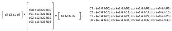 Figure 1 shows the state matrices of the AES-128 encryption algorithm after the “SubBytes” (S(i)), “ShiftRows”, and “MixColumns” layers. The “MixColumns” layer multiplies each column of matrix B to calculate matrix C.