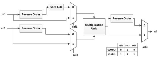 One of these upcoming extensions is the RISC-V cryptography extension (-crypto), which has two sets of instructions—Scalar & Entropy Source [5] and Vector [6]. The scalar extension has groups of instructions. The first group includes instructions that are borrowed from the upcoming bitmanip extension [7], and five other groups are designed to accelerate particular cryptography algorithms: AES [8], SHA-256 [9], SHA-512 [9], SM3 [10], and SM4 [11]. The scalar extension provides both 32-bit and 64-bit versions of the instructions. Similarly, the vector cryptography extension provides vector versions of some of the bitmanip instructions and vector instructions to accelerate the AES and the SHA2 [9] algorithms. The RISC-V cryptography extension task group published version v1.0.0-rc6 of the RISC-V Cryptography Extensions Volume 1—Scalar & Entropy Source Instructions [5]. There is a slight difference between the instructions explained in version v1.0.0-rc6 and the instructions that are evaluated in this work. In this work, we implemented grev[i], shlf[i], and unshlf[i], which were removed from the cryptography extension in version 0.7.2 [12]. These instructions are replaced with brev8, rev8, zip, and unzip instructions, which are simplified versions of grev[i], shlf[i], and unshlf[i].
