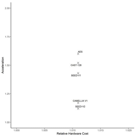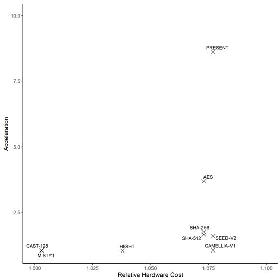 Acceleration vs. hardware cost of implementation of crypto implementations.