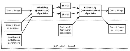 There are other fields in which subliminal channels may also be present. Visual cryptography is a technique of image encryption that works by creating meaningless shares that should be combined to recover the message [2]. From this perspective, it may be considered a secret-sharing method [3]. However, in visual cryptography, the “decryption” stage may be performed without using a computer, just by stacking the shares. This is because the human visual system perceives the mixture of white and black pixels as a gray level.