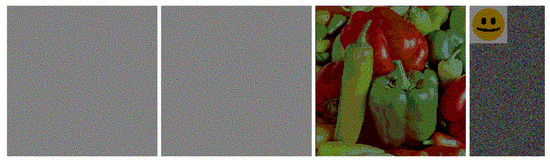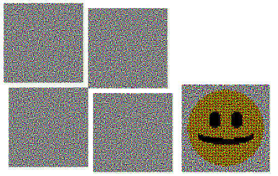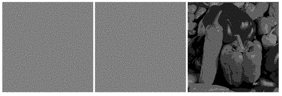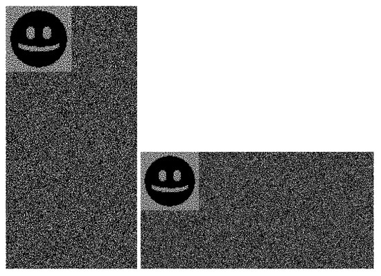 On the other hand, the encryption method may only be applied with a computer. The advantage of this approach is that it provides maximum security. As a reminder, subpixels in visual cryptography should resemble random noise. This is satisfied when the message is encrypted. The output of the encryption algorithm has roughly the same number of 0 and 1, and their distribution is random. Additionally, the cardinalities of and from Algorithm 2 are equal; therefore, each subpixel block in a resulting share is present with an equal probability of .