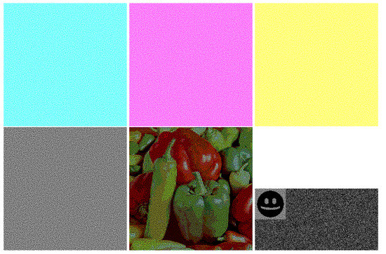 An overlapping method may also be applied to color visual cryptography. For the algorithm with a mask and three components, the result is almost identical as in Figure 11, so it will be omitted. For the algorithm with colorful shares, the results are presented in Figure 13 (single share) and Figure 14 (multiple shares). This time, a smaller image of peppers was used for the testing, and the secret shares therefore seem larger.
