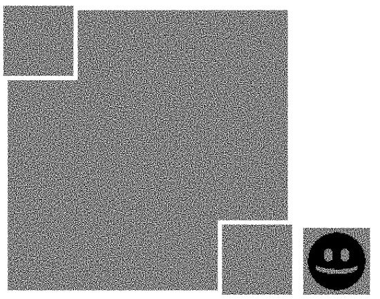 Figure 10 shows shares created with overlapping method and the result of their stacking. Subliminal channel for a single share is presented in Figure 11 in which secret parts are in opposite corners. Another subliminal channel is shown in Figure 12 in which two shares are overlapped to reveal the secret image.