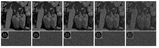 The result of hiding the encrypted binary image may be presented visually. Figure 9 shows regular shares and the result of their stacking, but also secret binary image recovered from the first share. This time, another secret image (Lena) was used because the smile picture is smaller than the cover image. This method allows an encrypted binary image of the same size as the carrier to be concealed.