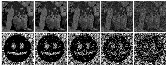 The encryption method has been tested for a text message and for an encrypted binary image. In the first case, lorem ipsum text of a maximum possible length was encrypted and hidden in halftone and color pepper images. The subpixels depend on the ciphertext, as presented in Table 3.