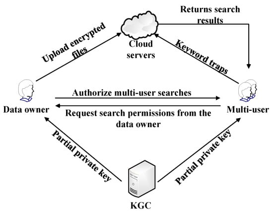 Figure 1 depicts the system model for the certificateless searchable encryption method based on a multi-user environment which contains four main subjects: data owner, multi-user, cloud server, and KGC. Table 1 shows the main symbols and explanations in this scheme.