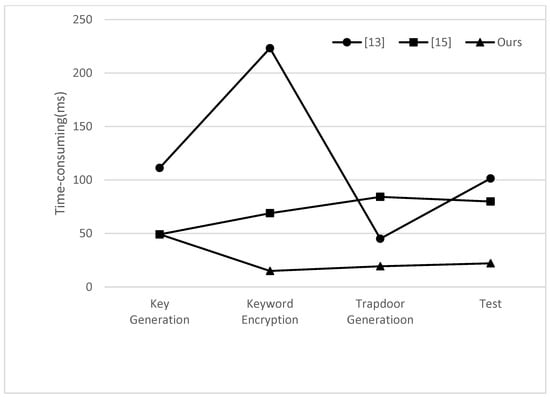 The computational cost of the key creation, encryption, trapdoor generation, and checking out algorithms used in this paper’s approach as well as other schemes is shown in Table 3. In this paper’s scheme, the key generation phase spends 49.243 ms, which is about 44% of that of scheme [13] compared with 111.276 ms of literature [13], and is slightly inferior though compared with 49.1384 ms of scheme [15]. However, in the encryption phase, the scheme in this paper spends about 14.94 ms, which is about 21% of scheme [13] and 6.6% of scheme [15] compared with 223.2 ms of scheme [13] and 68.9 ms of [15]. The spending of the scheme in this paper on trapdoor generation is about 19.32 ms compared with 45.1 ms in scheme [13] and 84.2 ms in scheme [15], which is about 42% of scheme [13] and 22% of scheme [15]. The spending of the scheme in this paper in the testing phase is about 22.1 ms, which is about 21% of scheme [13] and 27% of scheme [15] compared with 101.4 ms of scheme [13] and 79.9 ms of scheme [15]. The simulation effect can be seen in Figure 2, where it is evident that the multi-user environment-based CLEKS scheme in this research performs more effectively overall.