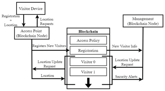 - Access points: Request updates from visitor devices and connect with blockchain nodes.