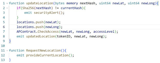 All transactions from a visitor’s device are authenticated with a hashchain created and stored locally on the NodeMCU. A hashchain is the ordered list of hash values obtained by repeatedly hashing a random value. The authentication via hashchain is done by publishing the hash values one by one starting with the last one in the list and confirming that the hash of a newly published value is the same as the previously published hash value. In our implementation the last value of the hash chain stored on the device is submitted as part of the registration and stored on the visitor contract. Every message from the visitor device after that includes the next hash value from the tail of the hashchain and is submitted to the visitor contract in the updateLocation transaction (Figure 4) to authenticate the visitor device. If the hash of the new value sent in the transaction is different from the currently stored hash value, then the message is not coming from the visitor device and an alert is issued. Otherwise, the stored hash value is replaced by the new value. With this authentication, we can assume the only entity capable of updating a visitor’s location is the corresponding visitor device assuming the hash function used is cryptographically secure. In our implementation we used SHA-256.
