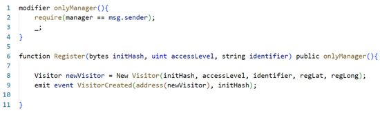 The access control functionality of our system is implemented via smart contracts on the blockchain. There are three smart contracts in our system: Registration Contract (RC), Visitor Contract (VC), and Access Policies Contract (APC). The RC and the APC are deployed to the blockchain by the authorized officials in the system The RC’s only purpose is to register new visitors and therefore only has one main function, Register. The Register function takes three arguments, namely, the access level of the visitor, the first published hash of a visitor’s hashchain, and an identifier for the visitor, and creates a visitor contract on the chain. The Register function will do so only if the request comes from an authorized account, the management account in our case. If the transaction which accessed the Register function was not sent from a management account, then the request is ignored, and a security alert is issued. Figure 5 shows the steps of the registration process and Figure 6 shows the code for the Register function of the Registration Contract.