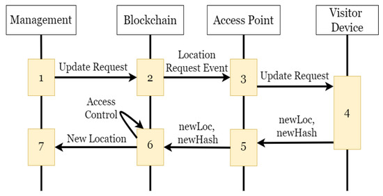 An instance of a VC stores all the data for one specific visitor. It stores the visitor’s access level which determines the locations the visitor is allowed to enter. It stores the current and previous locations of its paired visitor device and provides a method called updateLocation (provided in Figure 4) to submit new locations. The updateLocation function is the only way to update the current location stored in a visitor contract. As it was mentioned in the Visitor Device description, the VC also stores a published hash value that is used to authenticate that incoming messages are from the corresponding visitor device. Finally, the VC also has a method called RequestNewLocation that emits an event to request the paired visitor device send a location update. The communication for the request is done via an access point. Figure 7 shows this process.