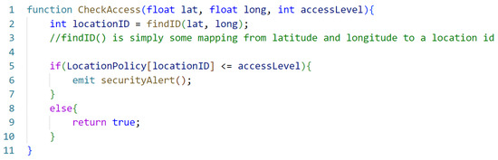 The final contract, APC, maintains access levels for locations. It has a simple method CheckAccess which takes a latitude-longitude pair and a visitor’s access level as input. Latitudes and longitudes are put into a mapping function and the access level for that area is found. If the visitor access level provided is not valid for the location, then an alert is sent to the Management system. If the access level is correct, then the visitor contract emits an event confirming its new location. It is important to note that when a VC updates its location, it automatically submits to the APC to validate its location. Since checking of access is done on the blockchain, an attacker is unable to stop the verifications or modify the transactions sent to the APC. Figure 8 shows the implementation of the CheckAccess function in our system.