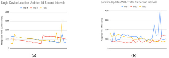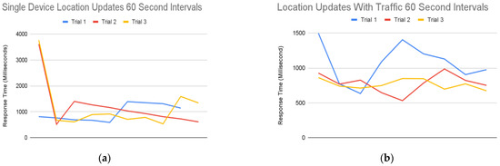 Time to update visitor location at 60 s request intervals over a period of 10 min: (a) Response times for a physical device alone on the network over three trials; (b) Response times for a physical device with 50 simulated virtual visitors on the network.
